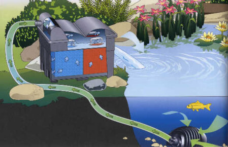 Leistungsstarker Durchlauffilter für Garten- und Fischteiche. Die Kombination aus Filterschaum und integriertem UVC-Vorklärgerät sorgt für beste Filterleistungen: Diverse Filterschwämme übernehmen die optimale mechanische und biologische Filtrierung. Zum Säubern hat der Durchlauffilter Reinigungshebel zum Ausdrücken der Filterschwämme, einen Bodenablauf und einen Klarspülanschluss.