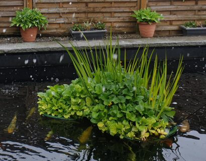 Diese Pflanzkörbe mit einem Styropor Treibring sind einfach zu verbinden und können auf jedem beliebigen Fleck auf der Wasseroberfläche angebracht werden. Das ergibt ein faszinierendes Bild, auch da wo der Teich zu tief ist um Sumpfpflanzen in den Boden zu pflanzen.